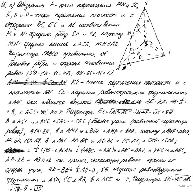 В правильной треугольной пирамиде SABC сторона основания AB равна 6, а боковое ребро SA равно Точки M и N — середины рёбер SA и SB соответственно. Плоскость α содержит прямую MN и перпендикулярна плоскости основания пирамиды.