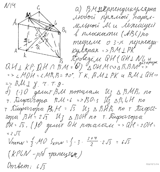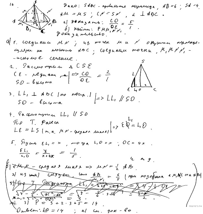 а) Отметим точку L — середину AB, O — основание высоты пирамиды, опущенной из вершины S (точка пересечения медиан треугольника ABC), K — точку пересечения SL и MN (очевидно, их общую середину) и — основание перпендикуляра из K на плоскость ABC. Поскольку