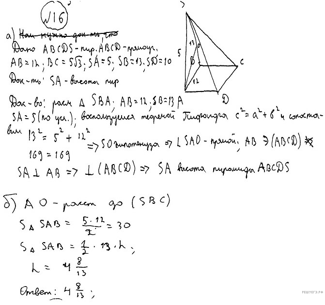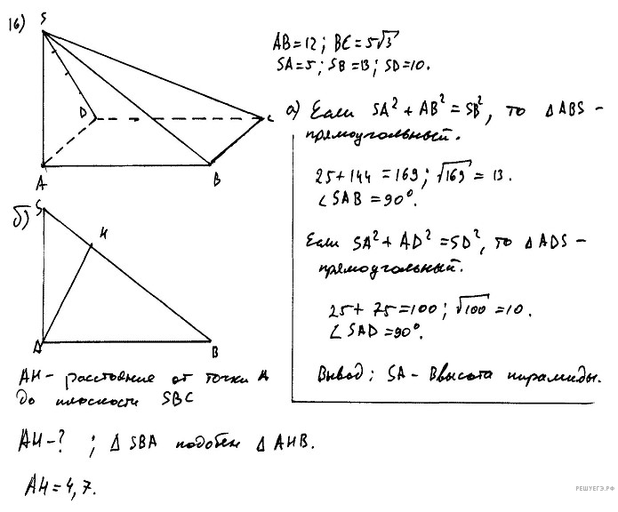 В основании четырёхугольной пирамиды SABCD лежит прямоугольник ABCD со сторонами AB = 12 и Длины боковых рёбер пирамиды SA = 5, SB = 13, SD = 10.