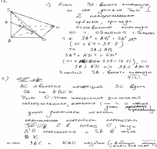поэтому стороны SA и AB, SA и AD перпендикулярны, значит, ребро SA перпендикулярно плоскости основания пирамиды.