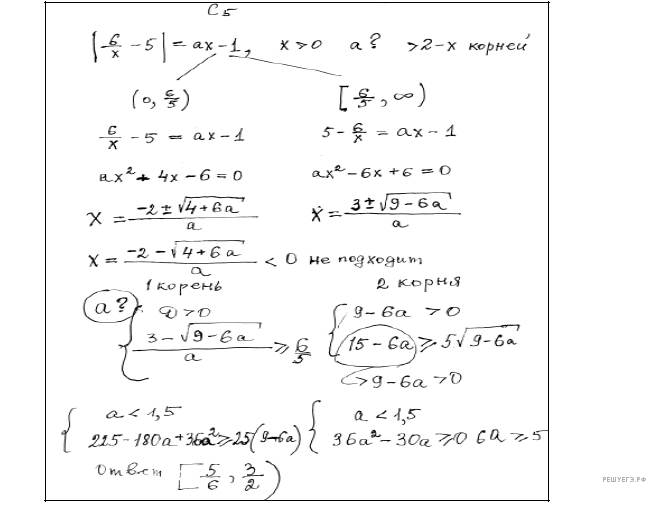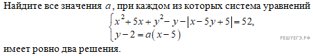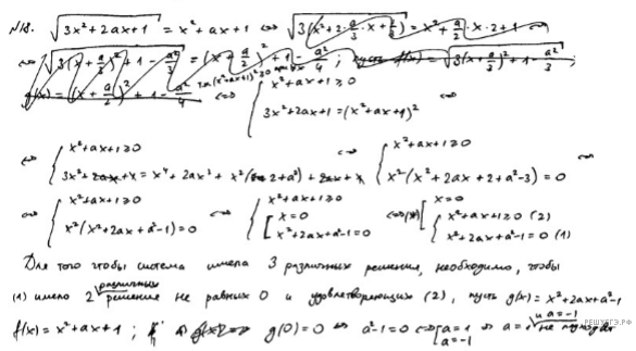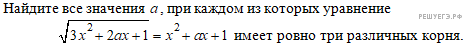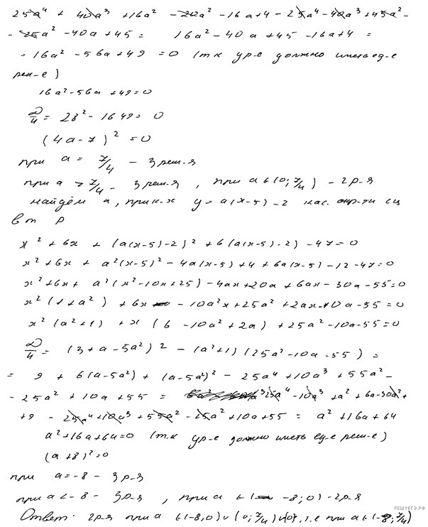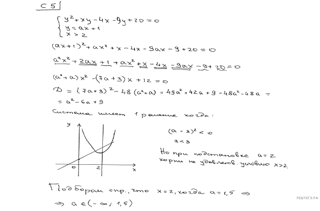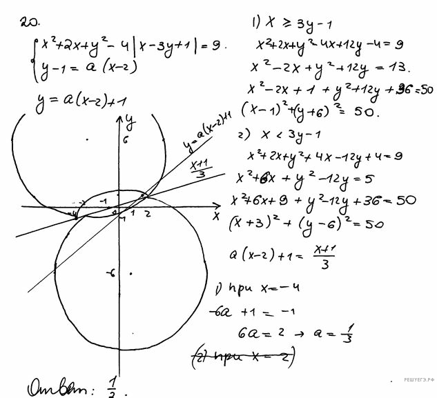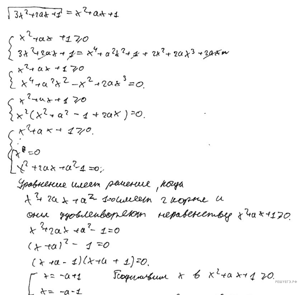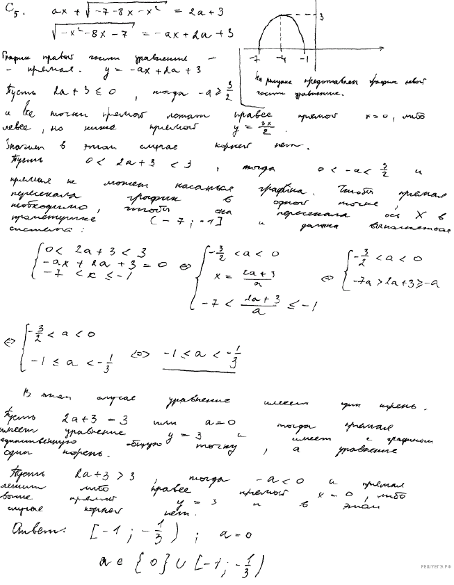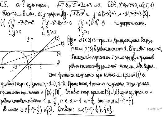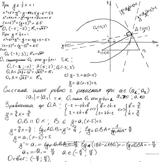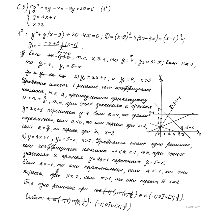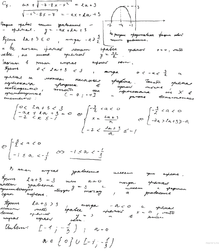 | Решение содержит: − или верное описание расположения двух лучей и прямой из условия задачи; − или верное получение квадратного уравнения с параметром a относительно одной из переменных | 1 |