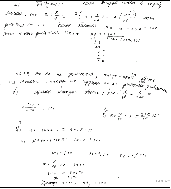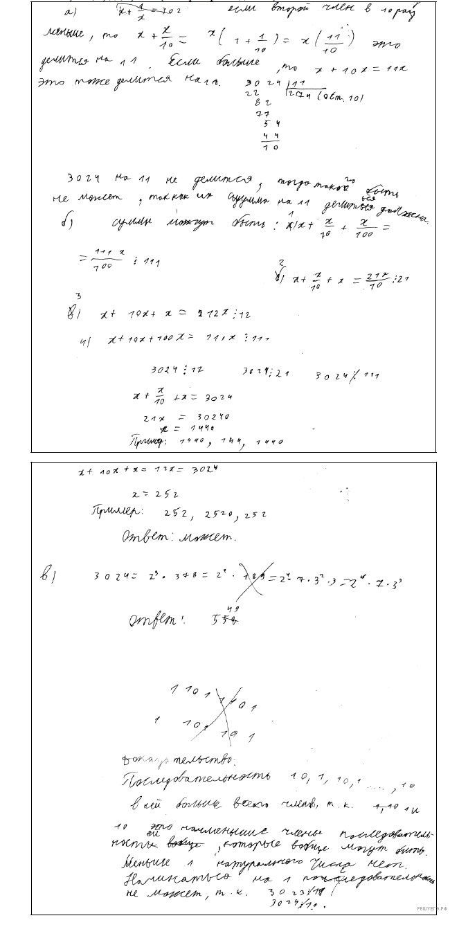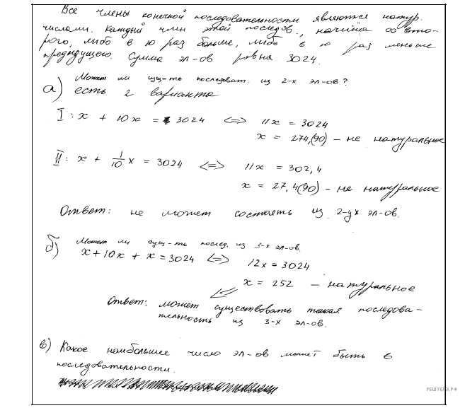 Все члены конечной последовательности являются натуральными числами. Каждый член этой последовательности, начиная со второго, либо в 10 раз больше, либо в 10 раз меньше предыдущего. Сумма всех членов последовательности равна 3024.