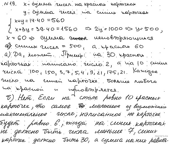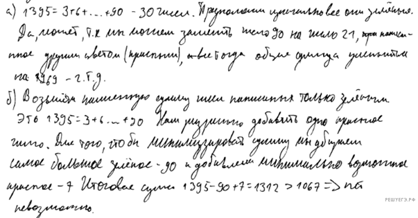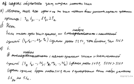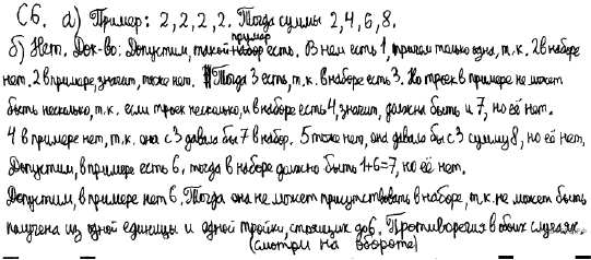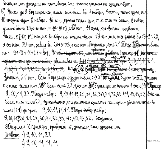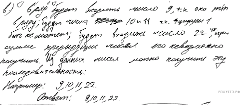 б) Поскольку задуманные числа натуральные, то наименьшее число в наборе — это наименьшее из задуманных чисел, а наибольшее число в наборе — это сумма всех задуманных чисел. Среди чисел записанного набора должна быть сумма всех чисел, кроме наименьшего, то есть 22 – 1 = 21. Но этого числа нет в наборе, поэтому не существует примера таких задуманных чисел, для которого на доске будет выписан набор из условия.