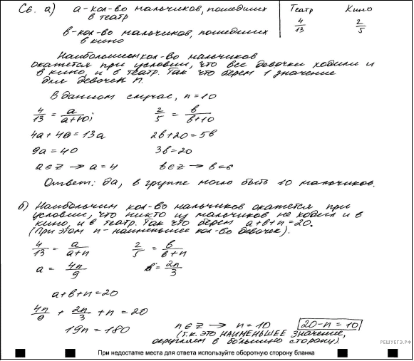 в) Предположим, что некоторый мальчик сходил и в театр, и в кино. Если бы вместо него в группе присутствовало два мальчика, один из которых посетил только театр, а другой — только кино, то доля мальчиков и в театре, и в кино осталась бы прежней, а общая доля девочек стала бы меньше. Значит, для оценки наименьшей доли девочек в группе можно считать, что каждый мальчик сходил или только в театр, или только в кино.
