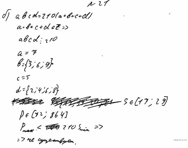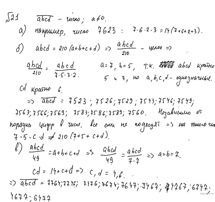 б) Предположим, что такое число n существует и a, b, c, d — его цифры. Заметим, что среди этих цифр не может быть нулей, так как иначе их произведение было бы равно нулю. Имеем: abcd = 210(a + b + c + d). Правая часть этого равенства делится на 35, поэтому среди цифр найдётся цифра 5 и цифра 7. Так как при перестановке местами цифр числа n равенство abcd = 210(a + b + c + d) остаётся верным, то без ограничения общности можно считать, что в числе n цифры c и d равны 5 и 7 соответственно. Тогда Получаем противоречие.