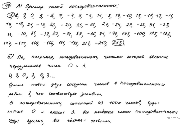 а) Например, последовательность 1, 2, 3, 0, 5, −2, 7, −4, …, 233, −230, 235 удовлетворяет условию задачи (чередуются суммы чисел 3 и 5).