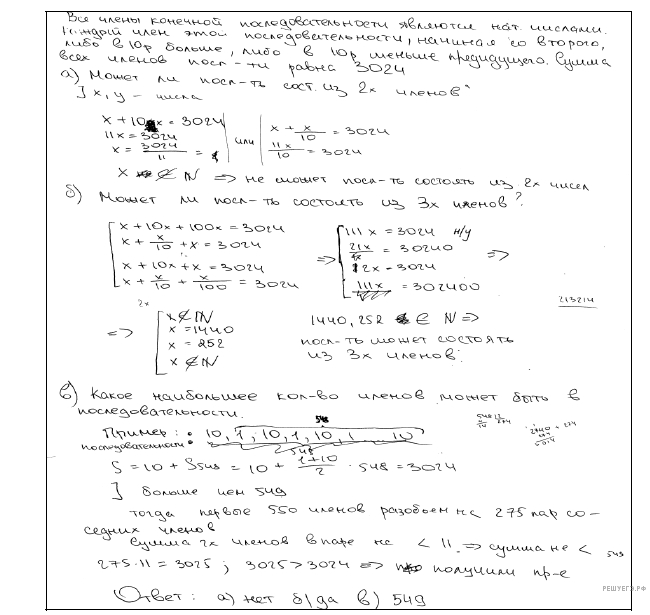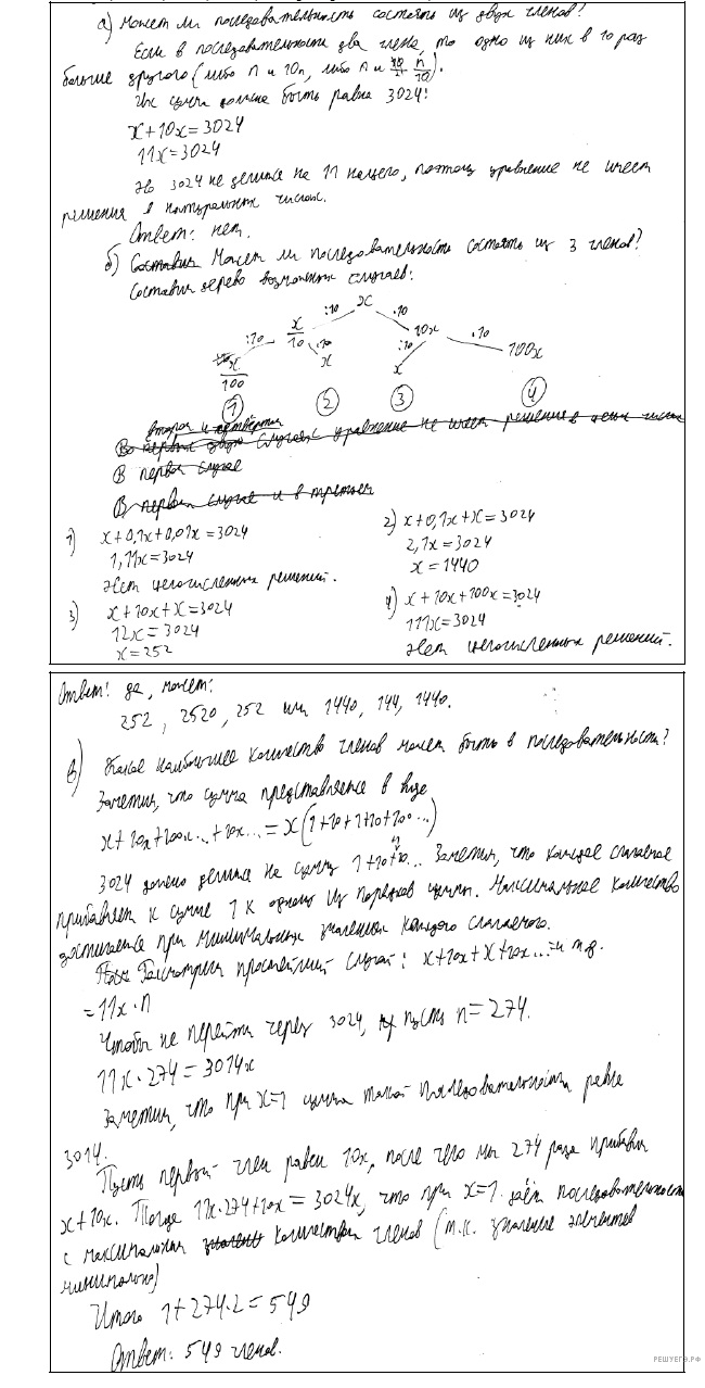 Все члены конечной последовательности являются натуральными числами. Каждый член этой последовательности, начиная со второго, либо в 10 раз больше, либо в 10 раз меньше предыдущего. Сумма всех членов последовательности равна 3024.