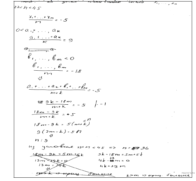 На доске написано более 27, но менее 45 целых чисел. Среднее арифметическое этих чисел равно −5, среднее арифметическое всех положительных из них равно 9, а среднее арифметическое всех отрицательных из них равно −18.