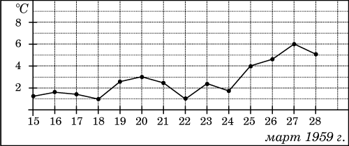 На рисунке жирными точками показана среднесуточная температура воздуха в Пскове каждый день с 15 по 28 марта 1959 года. По горизонтали указываются числа месяца, по вертикали - температура в градусах Цельсия. Для наглядности жирные точки соединены линией. Определите по рисунку, какой была наименьшая среднесуточная температура за указанный период. Ответ дайте в градусах Цельсия.