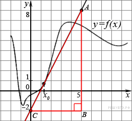 Значение производной в точке касания равно тангенсу угла наклона касательной к оси абсцисс. Построим треугольник с вершинами в точках