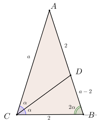 Версия для печати и копирования в MS WordБиссектриса CD угла ACB при основании равнобедренного треугольника ABC (AB = AC) делит сторону AB так, что AD = BC = 2.