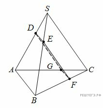 Построим сначала сечение пирамиды этой плоскостью. Для этого проведем в гранях SAC и SBC прямые, параллельные SC и проходящие через точки D и E. Пусть они пересекают AC и BC в точках G и F соответственно. Тогда DEFG — искомое сечение. Из параллельности, кроме того, следует, что Найдем теперь объем одной из частей, выразив его через объем всей пирамиды: