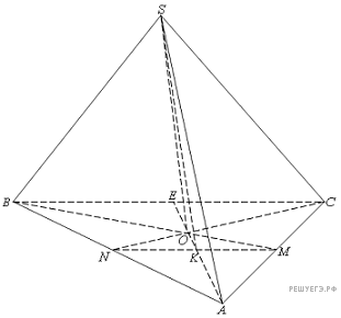 Обозначим О центр треугольника ABC. Тогда SO — высота заданной пирамиды, E — середина отрезка BC, К — точка пересечения MN и AE.