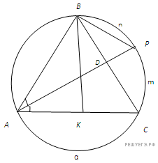 а) Угол ABP — вписанный. Он измеряется половиной градусной меры дуги АСР. Угол BDP как угол между двумя пересекающимися хордами окружности измеряется градусной мерой полусуммы дуг ВnР и АqС.