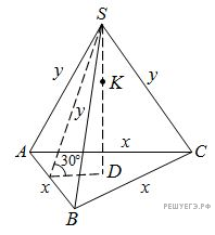 Версия для печати и копирования в MS WordВ правильной треугольной пирамиде SABC с вершиной S проведена высота SD. На отрезке SD взята точка K так, что SK : KD = 1 : 2. Известно, что двугранные углы между основанием и боковыми гранями равны 30 градусов, а расстояние от точки K до бокового ребра равно Найти объём пирамиды.