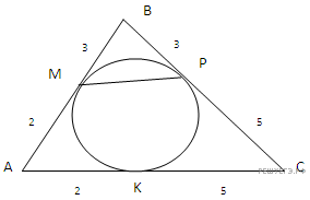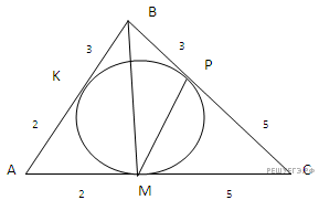 Версия для печати и копирования в MS WordДан треугольник ABC, где BA = 5, BC = 8. В треугольник вписана окружность, касающаяся стороны BC в точке Р. Известно, что ВР = 3. Найдите площадь треугольника ВМР, где М — точка касания окружности со стороной треугольника АВС.
