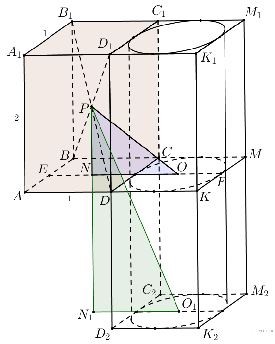 В задаче возможен и второй случай, когда цилиндр находится по другую сторону от основания CDMK. Тогда расстояние от центра верхнего основания CDMK все так же равно а от нижнего теперь другое: