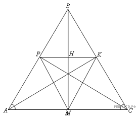 В равнобедренном треугольнике ABC (AB = BC) проведены биссектрисы AK, BM, CP.