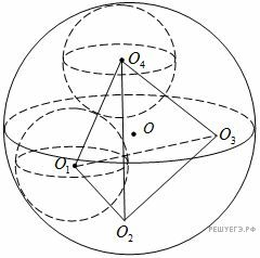 Спрятать критерииПусть сфера радиуса r с центром O касается внутренним образом данных сфер с центрами O1, O2, O3 и O4. Тогда O — центр правильного тетраэдра O1O2O3O4, ребро которого равно 2. Радиус R сферы, описанной около правильного тетраэдра O1O2O3O4, равен его высоты, т. е.