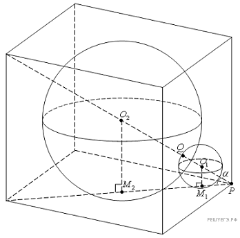 Пусть ка­са­ю­щи­е­ся шары ра­ди­у­сов r‍ и R‍ (r < R)‍ с цен­тра­ми O‍1,‍ O‍2‍ впи­са­ны в трёхгран­ный угол с вер­ши­ной P‍ не­ко­то­ро­го куба, M‍1‍ и M‍2  — ‍ точки ка­са­ния шаров с плос­ко­стью какой-ни­будь грани трёхгран­но­го угла, Q  — ‍ точка ка­са­ния шаров. Тогда O‍1M‍1‍ и O‍2M‍2  — ‍ пер­пен­ди­ку­ля­ры к этой плос­ко­сти, точка Q‍ лежит на от­рез­ке O‍1O‍2,‍ пря­мая O‍1O‍2‍ об­ра­зу­ет с этой плос­ко­стью угол α.‍