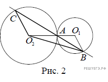 Второй случай: окружности касаются внешним образом (рис. 2), тогда точка А лежит между точками B и С,