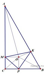 В прямоугольный треугольник ABC вписана окружность, которая касается гипотенузы AB в точке K, а катетов — в точках P и M.