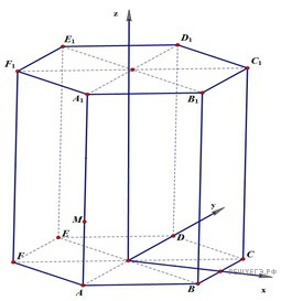 Поместим заданную призму в прямоугольную декартову систему координат, как показано на рисунке. Выпишем координаты некоторых точек: