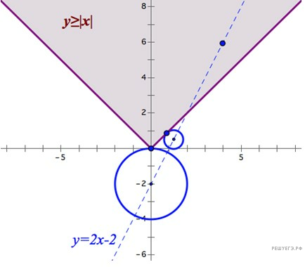 Поскольку пара (4; 6) удовлетворяет неравенству y≥ |x|, a = 4 — одно из искомых значений параметра. Неравенство y ≥ |x| не допускает отрицательных значений переменной у, значит, интересующие нас пары (x; у) — точки (x; у) плоскости не могут находиться ниже ломаной y = |x|. Но они не могут находиться и выше ломаной y = |x|, в противном случае получим бесчисленное множество решений системы. Таким образом, в дальнейшем нас будут интересовать только лишь пары (x; у), удовлетворяющие условию x = у. В то же время нас будут интересовать только лишь касание заданной окружности с ломаной y = |x|. Ясно, что центры окружностей при этом будет расположены ниже рассматриваемой ломаной. Рассмотрим случай, когда x = у = 0. (При этом центр окружности будут иметь координаты 0 и −2 соответственно). В этом случае, как нетрудно заметить, окружность и ломаная будут иметь лишь одну общую точку. Получим: