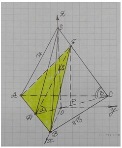 б) В плоскости (DSC), которая содержит высоту пирамиды SO, через точку E проведем прямую, пересекающую ребро SC в точке F. Соединим эту точку с вершинами Aи B пирамиды. Δ AFB — сечение, упомянутое в условии задачи.
