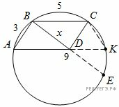 Через вершины А, В, С параллелограмма ABCD со сторонами AB = 3 и BC = 5 проведена окружность, пересекающая прямую BD в точке E, причем BE = 9.