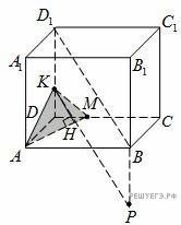 ), значит, точка K тоже лежит в плоскости сечения и сечение — треугольник AMK. Опустим из K перпендикуляр KH на AM. Тогда по теореме о трех перпендикулярах