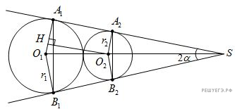 а) Обозначим угол между касательными за точку их пересечения за S, центры окружностей за