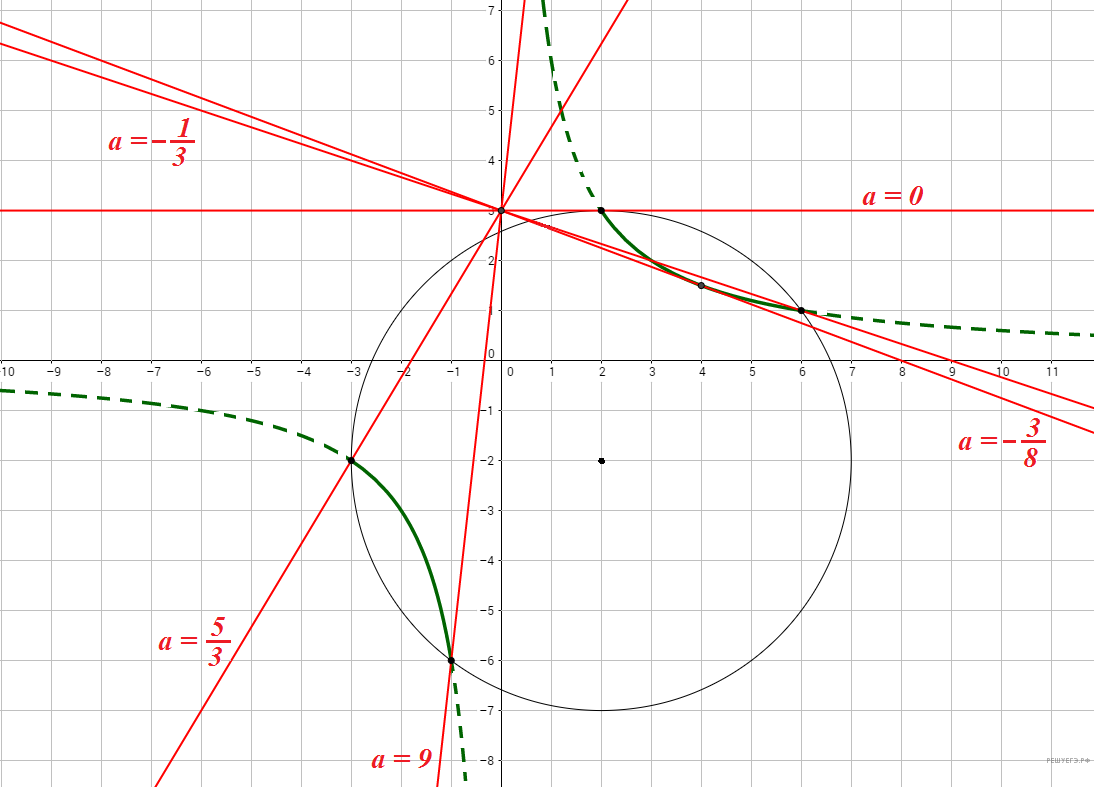 Найдём при каких значениях a прямая касается гиперболы.