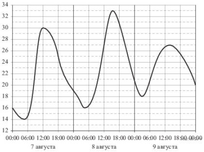 На ри­сун­ке по­ка­за­но из­ме­не­ние тем­пе­ра­ту­ры воз­ду­ха на про­тя­же­нии трёх суток. По го­ри­зон­та­ли ука­зы­ва­ет­ся дата и время, по вер­ти­ка­ли  — зна­че­ние тем­пе­ра­ту­ры в гра­ду­сах Цель­сия. Опре­де­ли­те по ри­сун­ку наи­боль­шую тем­пе­ра­ту­ру воз­ду­ха 9 ав­гу­ста. Ответ дайте в гра­ду­сах Цель­сия.