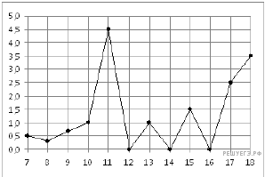 Версия для печати и копирования в MS WordНа рисунке жирными точками показано суточное количество осадков, выпадавших в Элисте с 7 по 18 декабря 2001 года. По горизонтали указываются числа месяца, по вертикали — количество осадков, выпавших в соответствующий день, в миллиметрах. Для наглядности жирные точки на рисунке соединены линией. Определите по рисунку, сколько дней из данного периода выпадало менее 2 миллиметров осадков.