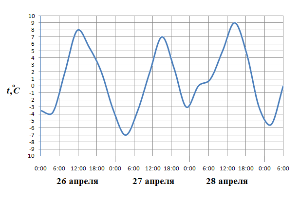 На рисунке показано изменение температуры воздуха на протяжении трех суток. По горизонтали указывается дата и время суток, по вертикали — значение температуры в градусах Цельсия. Определите по рисунку наименьшую температуру воздуха 27 апреля. Ответ дайте в градусах Цельсия.