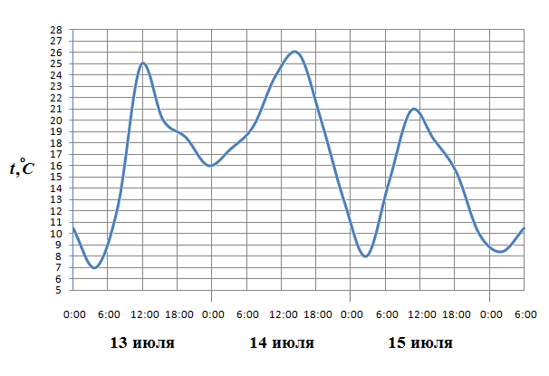 Из графика видно, что 15 июля наибольшая температура составляла 21 °C, а наименьшая 8 °C. Их разность составляет 13 °C.