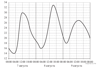 На ри­сун­ке по­ка­за­но из­ме­не­ние тем­пе­ра­ту­ры воз­ду­ха на про­тя­же­нии трех суток. По го­ри­зон­та­ли ука­зы­ва­ет­ся дата и время суток, по вер­ти­ка­ли  — зна­че­ние тем­пе­ра­ту­ры в гра­ду­сах Цель­сия. Опре­де­ли­те по ри­сун­ку наи­мень­шую тем­пе­ра­ту­ру воз­ду­ха 9 ав­гу­ста. Ответ дайте в гра­ду­сах Цель­сия.