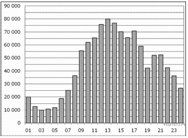 Версия для печати и копирования в MS WordНа диаграмме показано количество посетителей сайта РИА Новости в течение каждого часа 8 декабря 2009 года. По горизонтали указывается номер часа, по вертикали — количество посетителей сайта за данный час. Определите по диаграмме, за какой час в данный день на сайте РИА Новости побывало максимальное количество посетителей.