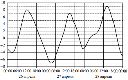 На ри­сун­ке по­ка­за­но из­ме­не­ние тем­пе­ра­ту­ры воз­ду­ха на про­тя­же­нии трех суток. По го­ри­зон­та­ли ука­зы­ва­ет­ся дата и время суток, по вер­ти­ка­ли  — зна­че­ние тем­пе­ра­ту­ры в гра­ду­сах Цель­сия. Опре­де­ли­те по ри­сун­ку наи­боль­шую тем­пе­ра­ту­ру воз­ду­ха 28 ап­ре­ля. Ответ дайте в гра­ду­сах Цель­сия.