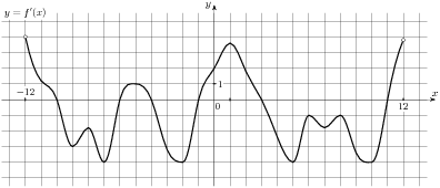 На рисунке изображен график производной функции f(x), определенной на интервале (−7; 14). Найдите количество точек максимума функции f(x) на отрезке [−6; 9].