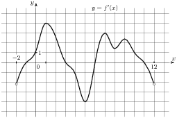 На ри­сун­ке изоб­ра­жен гра­фик про­из­вод­ной функ­ции f(x), опре­де­лен­ной на ин­тер­ва­ле (−2; 12). Най­ди­те про­ме­жут­ки убы­ва­ния функ­ции f(x). В от­ве­те ука­жи­те длину наи­боль­ше­го из них.