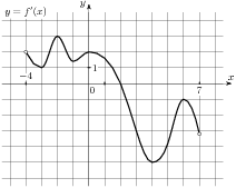 Если производная в некоторой точке равна нулю и меняет знак, то это точка экстремума. На отрезке [−2; 6] график производной пересекает ось абсцисс, производная меняет знак с плюса на минус. Следовательно,