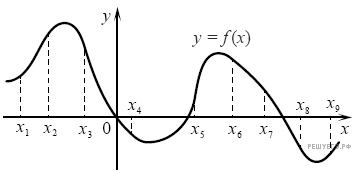 На рисунке изображён график функции y = f(x) и отмечены девять точек на оси абсцисс: x1, x2, x3, x4, x5, x6, x7, x8, x9. В скольких из этих точек производная функции f(x) отрицательна?
