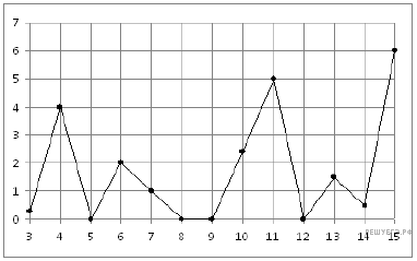 На рисунке жирными точками показано суточное количество осадков, выпадавших в Казани с 3 по 15 февраля 1909 года. По горизонтали указываются числа месяца, по вертикали — количество осадков, выпавших в соответствующий день, в миллиметрах. Для наглядности жирные точки на рисунке соединены линией. Определите по рисунку, какого числа впервые выпало 5 миллиметров осадков.