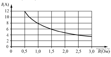 Мощность отопителя в автомобиле регулируется дополнительным сопротивлением, которое можно менять, поворачивая рукоятку в салоне машины. При этом меняется сила тока в электрической цепи электродвигателя — чем меньше сопротивление, тем больше сила тока и тем быстрее вращается мотор отопителя. На рисунке показана зависимость силы тока от величины сопротивления. На оси абсцисс откладывается сопротивление (в омах), на оси ординат — сила тока в амперах. Каково сопротивление цепи (в омах), если сила тока составляет 12 ампер?
