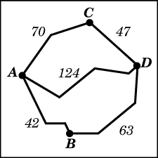Из пункта А в пункт D ведут три дороги. Через пункт В едет грузовик со средней скоростью 36 км/ч, через пункт С едет автобус со средней скоростью 48 км/ч. Третья дорога — без промежуточных пунктов, и по ней движется легковой автомобиль со средней скоростью 56 км/ч. На рисунке показана схема дорог и расстояние между пунктами по дорогам.