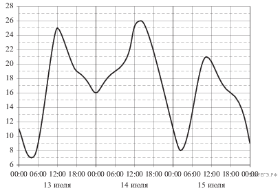 На рисунке показано изменение температуры воздуха на протяжении трех суток. По горизонтали указывается дата и время суток, по вертикали — значение температуры в градусах Цельсия. Определите по рисунку наибольшую температуру воздуха 15 июля. Ответ дайте в градусах Цельсия.