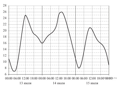 На рисунке показано изменение температуры воздуха на протяжении трех суток. По горизонтали указывается дата и время суток, по вертикали — значение температуры в градусах Цельсия. Определите по рисунку наибольшую температуру воздуха 13 июля. Ответ дайте в градусах Цельсия.