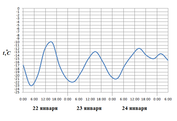 На рисунке показано изменение температуры воздуха на протяжении трех суток. По горизонтали указывается дата и время суток, по вертикали — значение температуры в градусах Цельсия. Определите по рисунку наибольшую температуру воздуха 22 января. Ответ дайте в градусах Цельсия.
